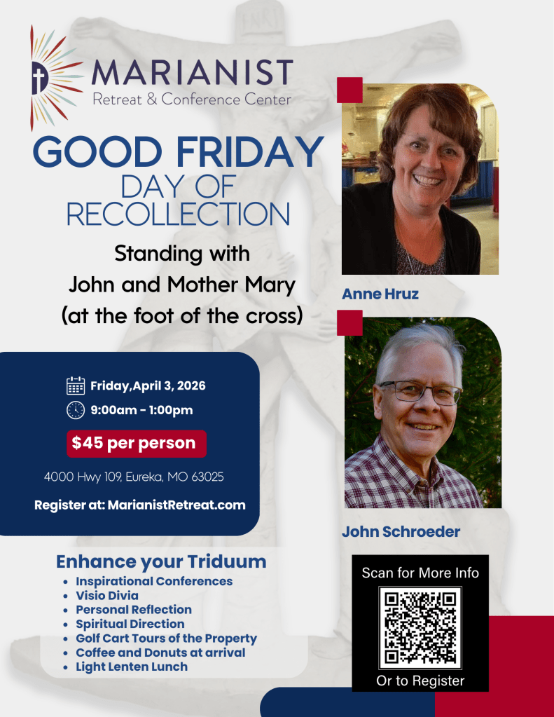 If you’re interested, there’s still time to register for the Good Friday morning of reflection (April 3) at the Marianist Retreat and Conference Center. My friend Anne Hruz and I will be teaming up to help you make it a prayerful day…