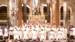 The ‘Laying on of Hands’ took a long time to accomplish…as the procession of priests filed by each of the six ordinandi. And that gave me lots of time to happily reflect on just how well Jesus’ promise to us has been kept; how through the centuries we have been given an unbroken succession of advocates and ministers to testify about Christ’s presence among us. Believe me: It really drives the point home when you see the Cathedral Basilica’s (very large) sanctuary filled with priests – a blessed bounty of both new and experienced servants of God to reassure us that we never have to walk the journey alone.