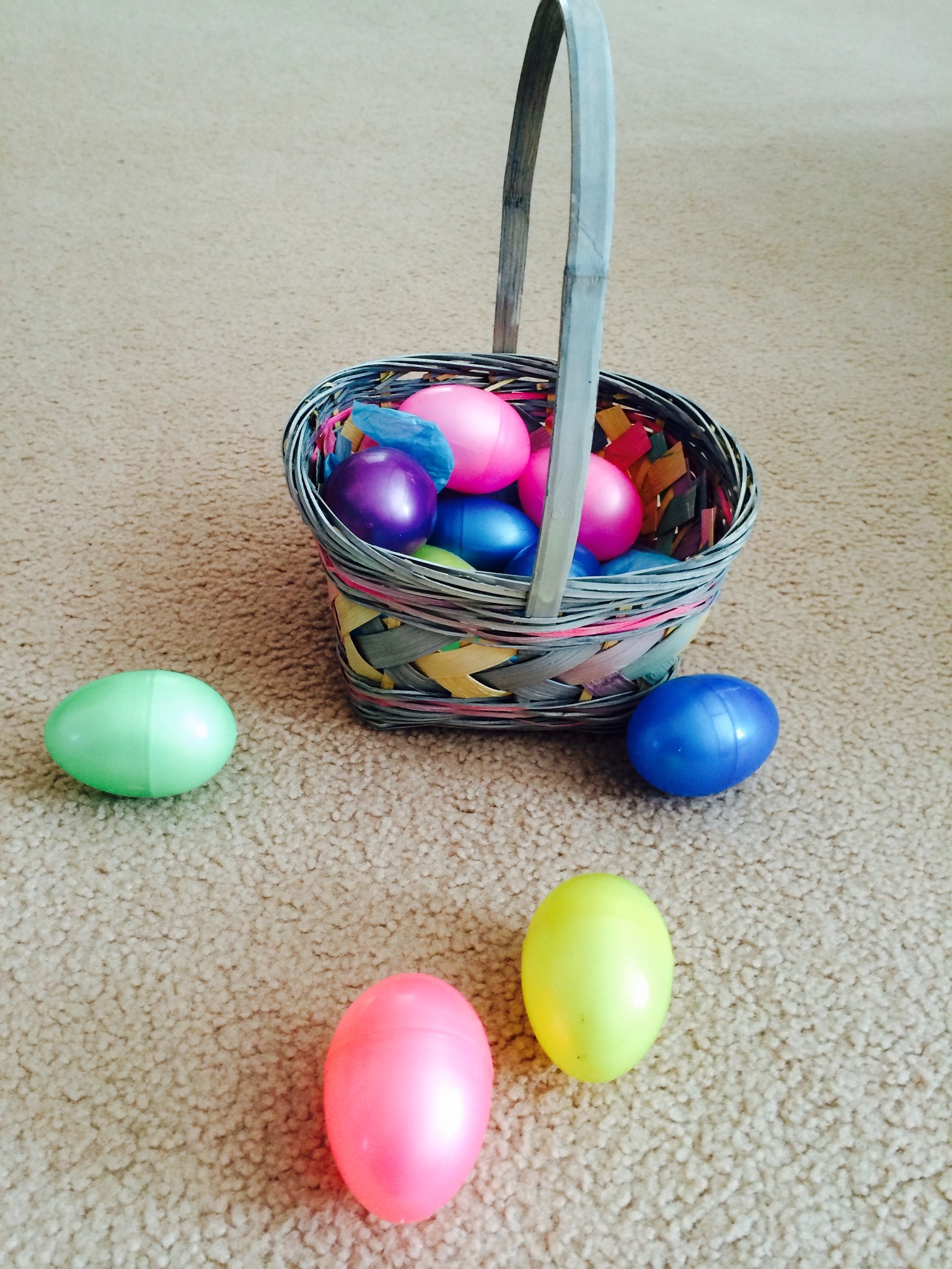 Looking ahead to the upcoming holiday, Gerri thought it might be fun to give our 14-month-old granddaughter a little practice hunting Easter eggs. So Grandma playfully scattered eight or nine brightly-colored plastic orbs across the carpet…equipped young Hannah with an equally colorful wicker basket to collect them in…and set her loose.
