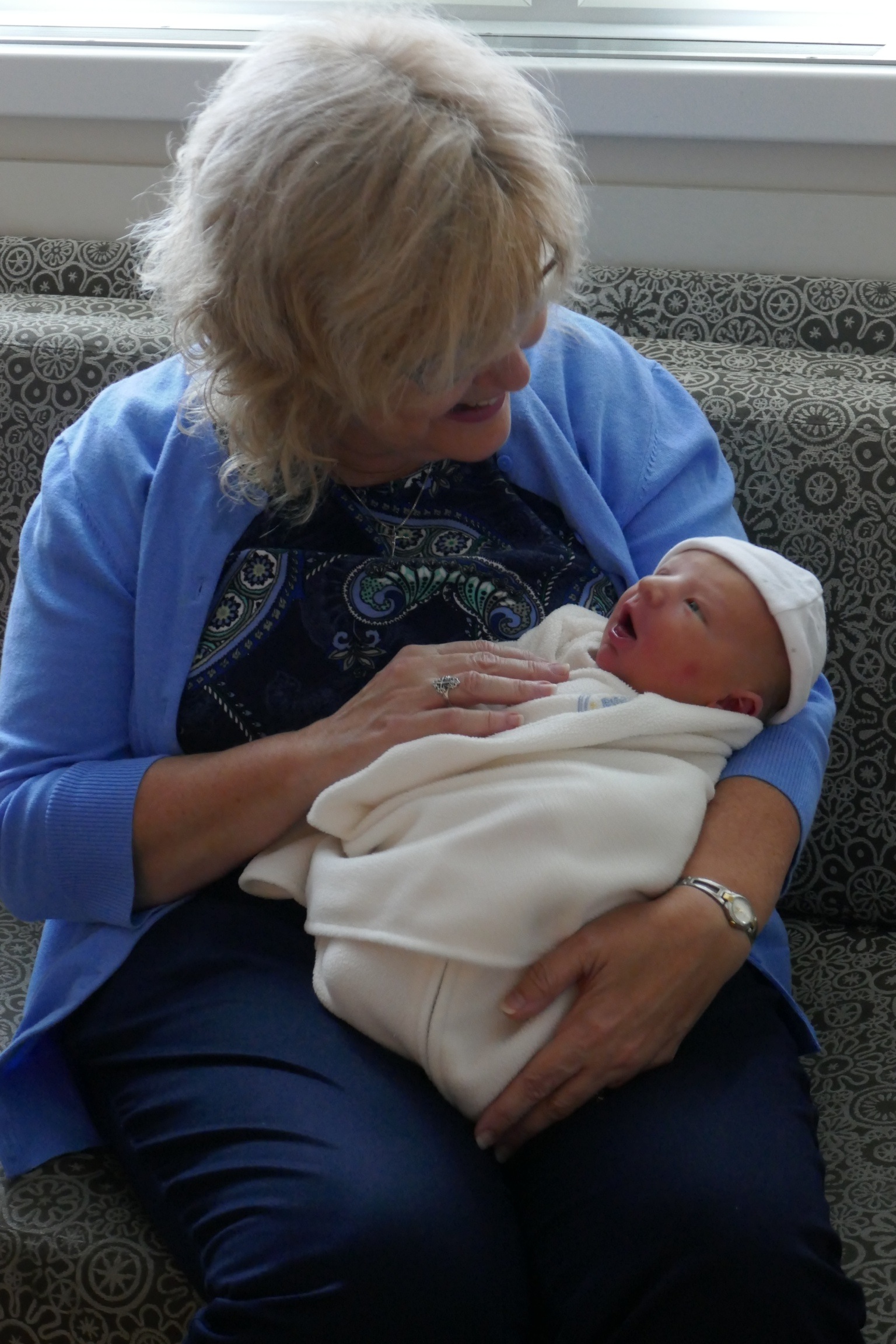First-born son to our daughter Ellen and her husband Shane, the little guy weighed in at a healthy 8 lbs 13 oz. He’s got good lungs, too, if his newborn cries are an accurate indicator. And an emerging curiosity: He doesn’t hesitate to open his eyes, soaking in the strange and wonderful sights all around.