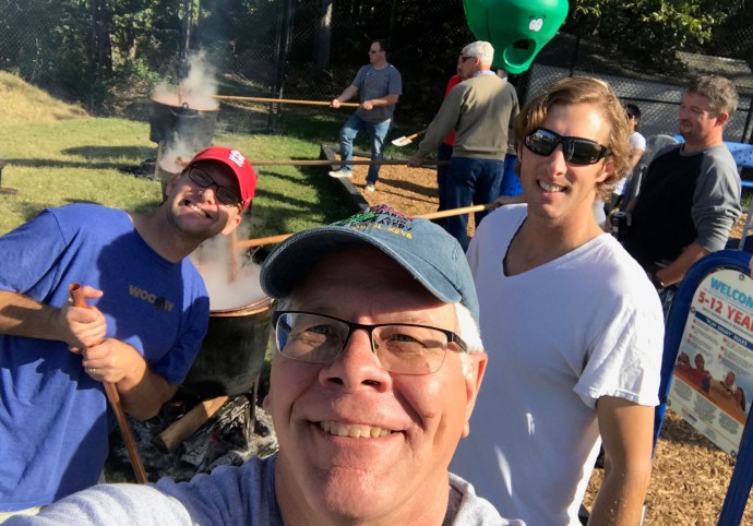 By the time I arrived (a little after 9 AM), our annual parish apple-butter cooking was in full swing Saturday morning: Four enormous copper kettles, all a-bubble-splosh-and-steaming…accompanied by an iTunes sound track already well into its “country” playlist.