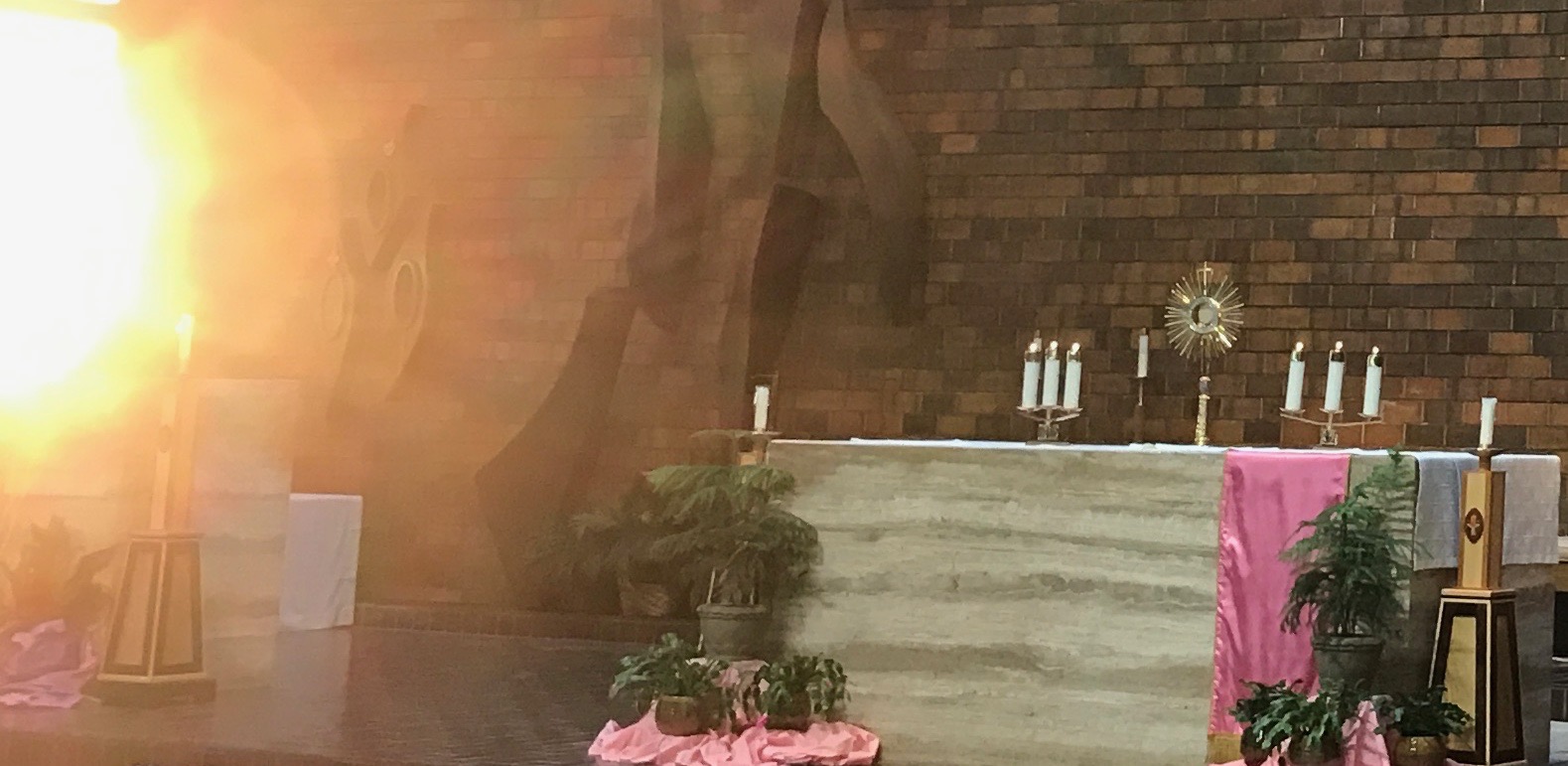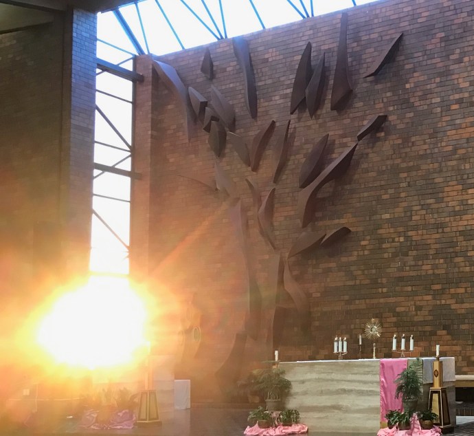It is a rare thing to encounter a monstrance bathed in such wondrous light. It doesn’t normally happen in our church – this accident, this happy coincidence of daypart, liturgical season and building design. So I took the opportunity to savor the moment: