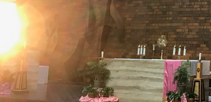 The flip side, of course, is that we now get to enjoy daylight past the dinner hour. A couple of days ago, in fact, it extended all the way into Holy Hour…adding a spectacular (and unexpected) feature to the Lenten devotion my parish has begun in 2018.