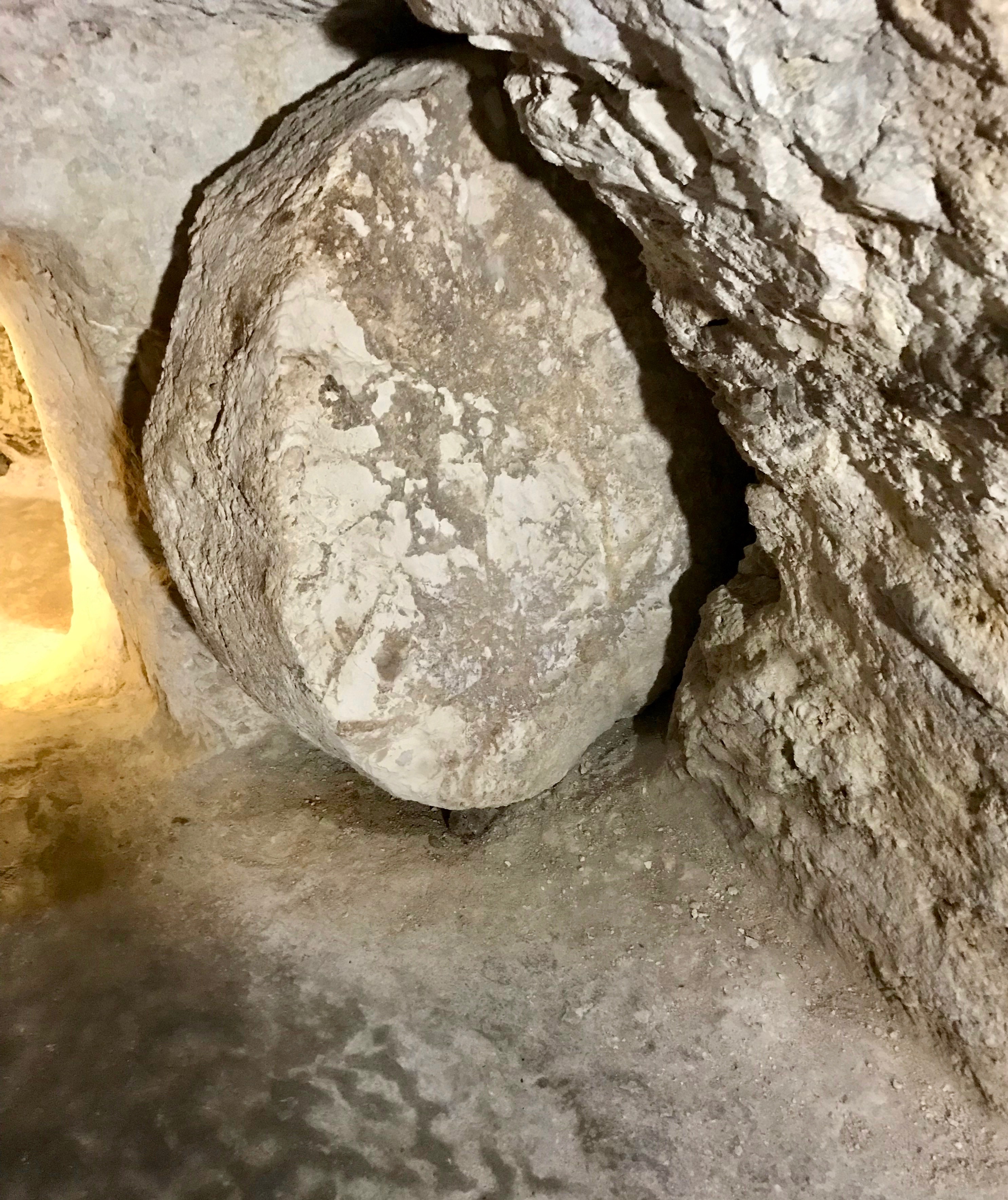 Whatever its provenance, it is without question a stone meant for rolling. Designed to be rolled over the stench of death. And exactly the sort of stone that would be rolled back…when death is conquered. When Jesus rose from the grave.