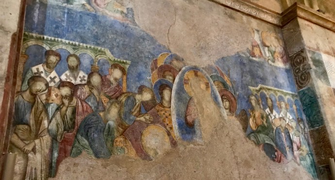 This week’s events reminded me of Isaiah’s promise – and the silent grace I witnessed a few months back in the Holy Land. In the village of Abu Ghosh, just outside Jerusalem, there stands a Crusader-era church – St. Mary of the Resurrection Abbey. It’s notable for the frescoes of holy men and women that adorn the walls…frescoes viciously desecrated by a later generation of religious fanatics.