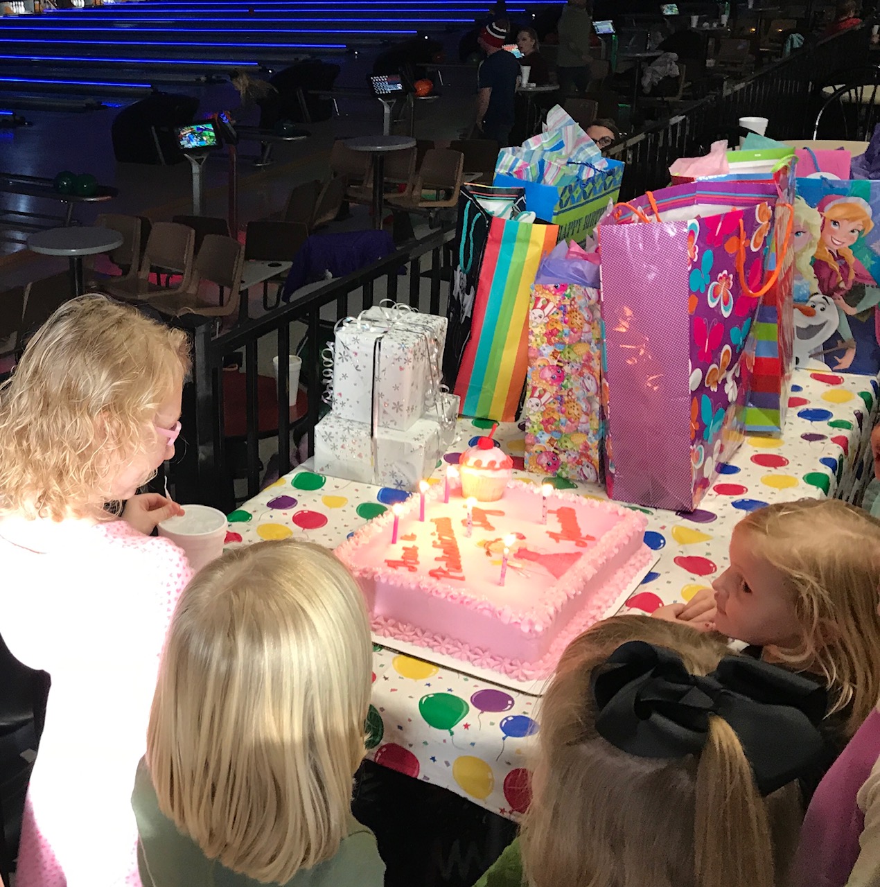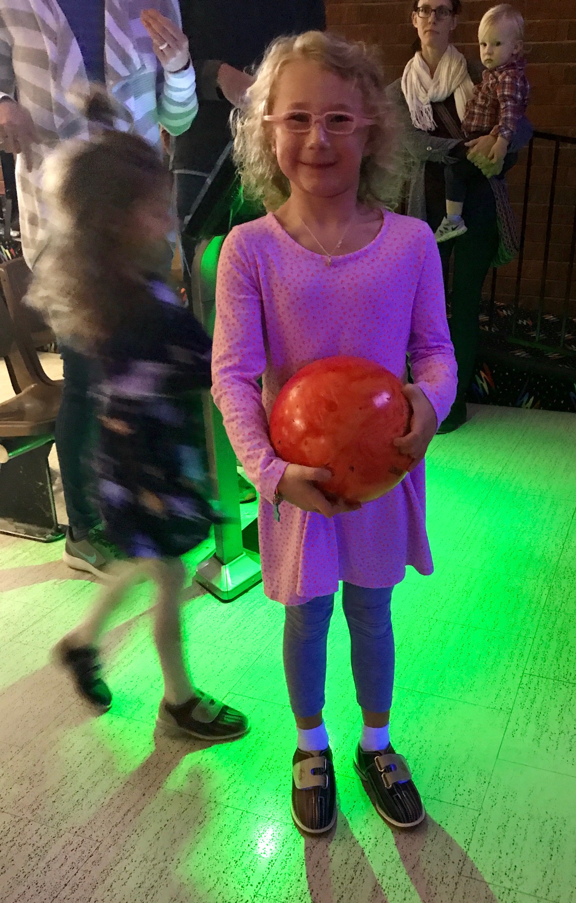 Which is only to be expected, I suppose, with an excitable crew of five-, six- and seven-year-olds milling about at the head of the lanes. It was “birthday party time” for granddaughter Hannah, you see – and a brilliant stroke of foresight it turned out to be…to give all the gathered girls and boys a ready outlet for their pent-up energy.