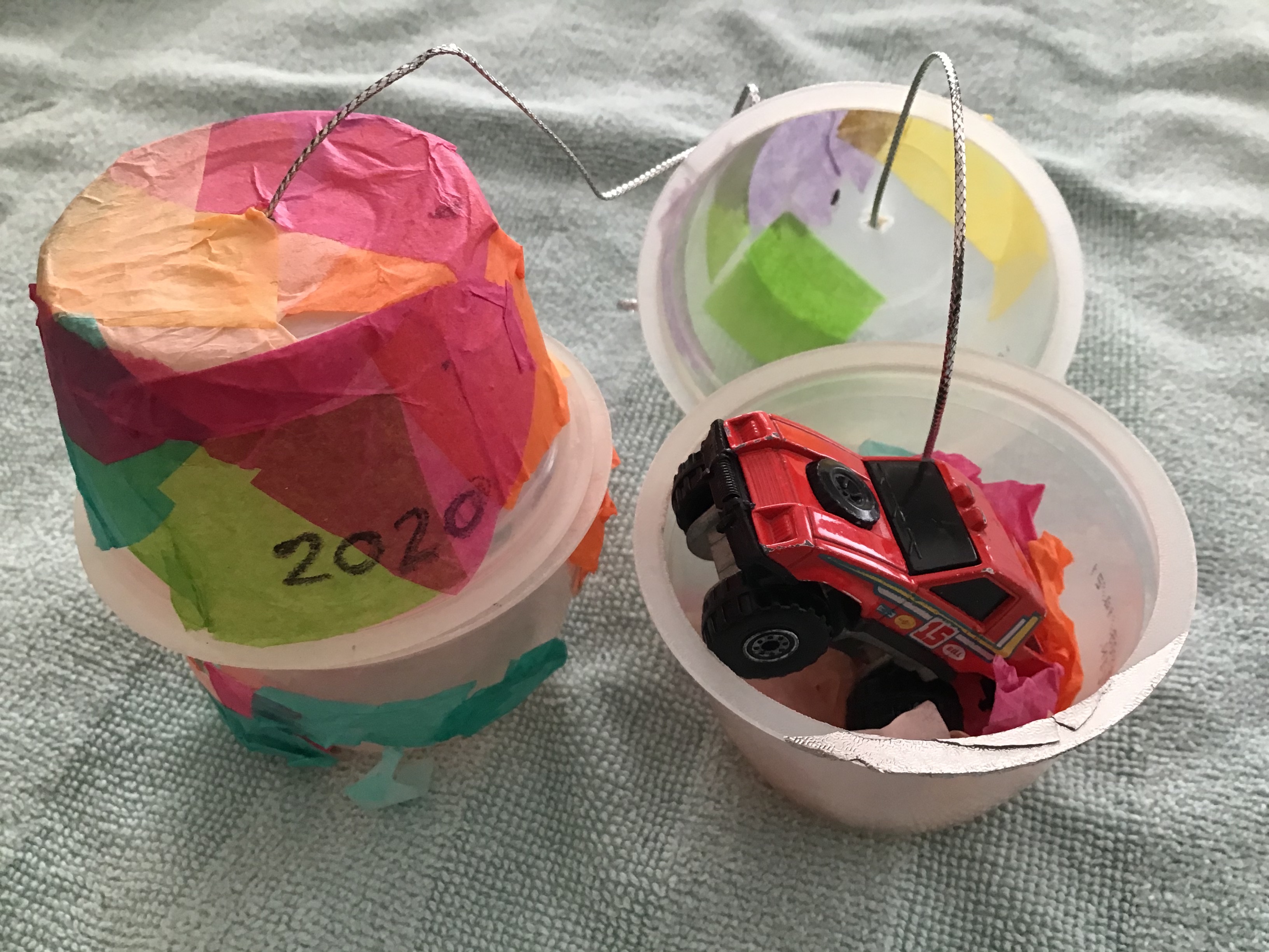 Then when I broke open one of the “eggs”, my heart skipped a beat: Grandson #1 had enclosed a personal treasure – a Hot Wheels 4X4 Monster Truck.