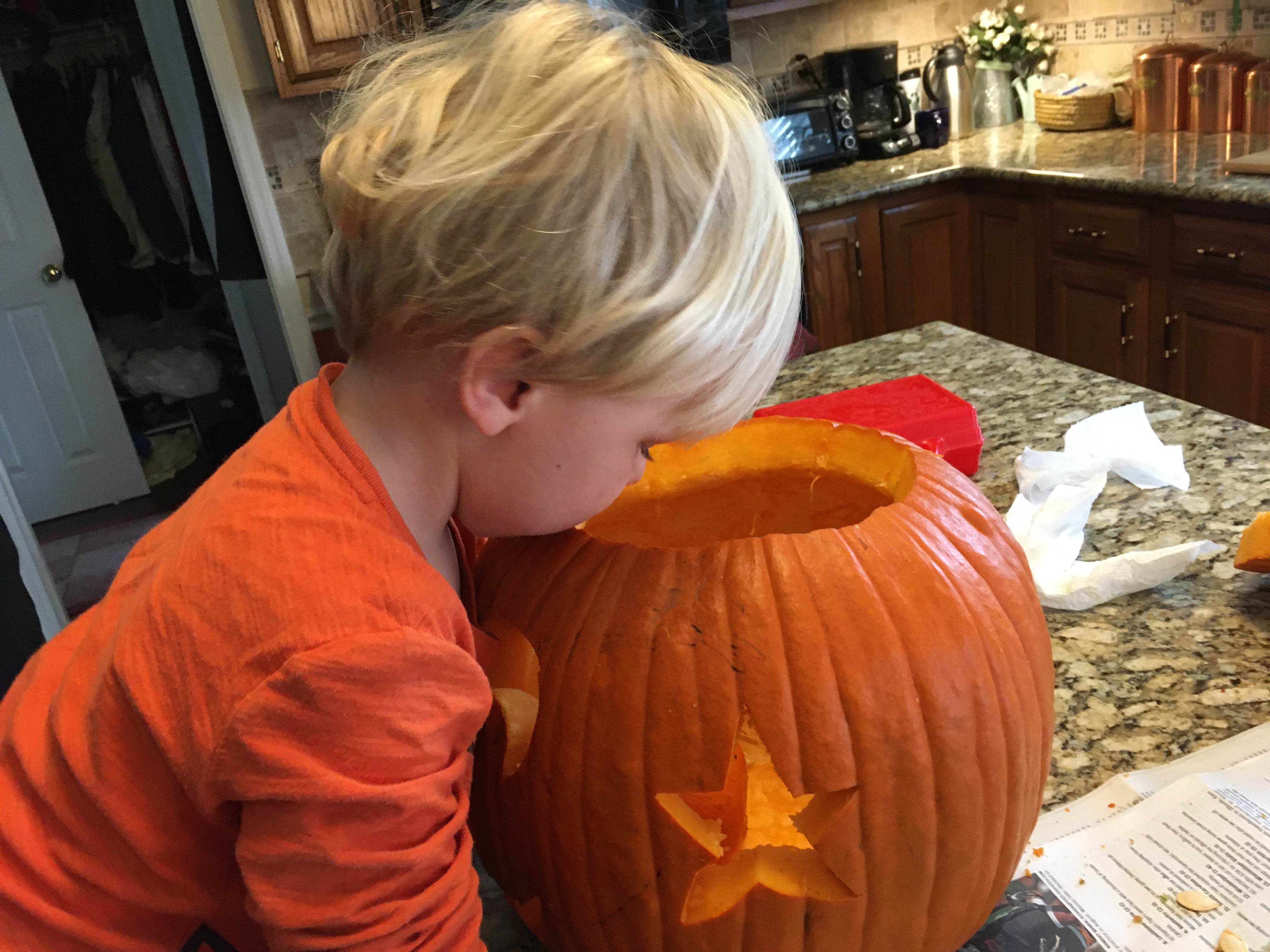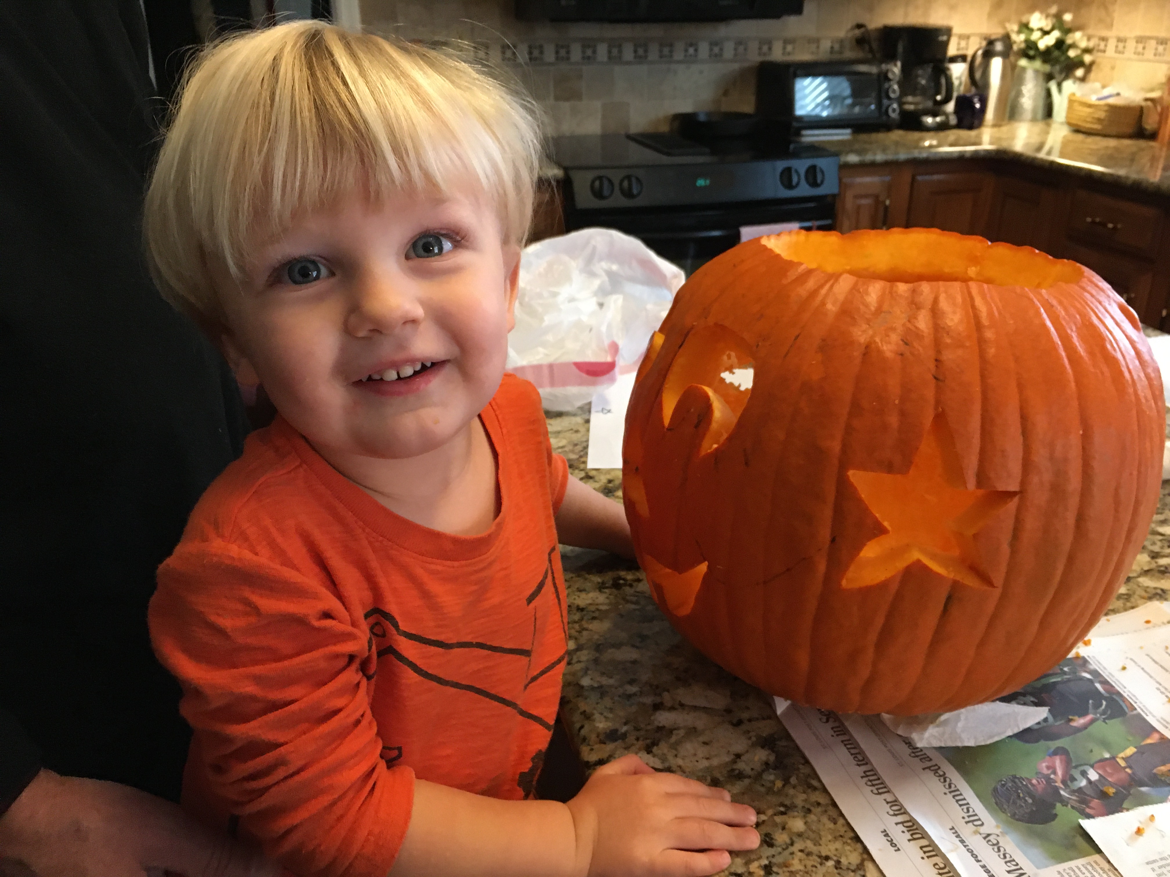 And I do mean engaging. Few spectacles have more power than pumpkin guts…to enthrall the 2- and 4-year-old imagination. Slimy, stringy, smelly – a pumpkin’s innards are a little boy’s wonderland (as long as there’s some grown-up around the clean up the mess.)