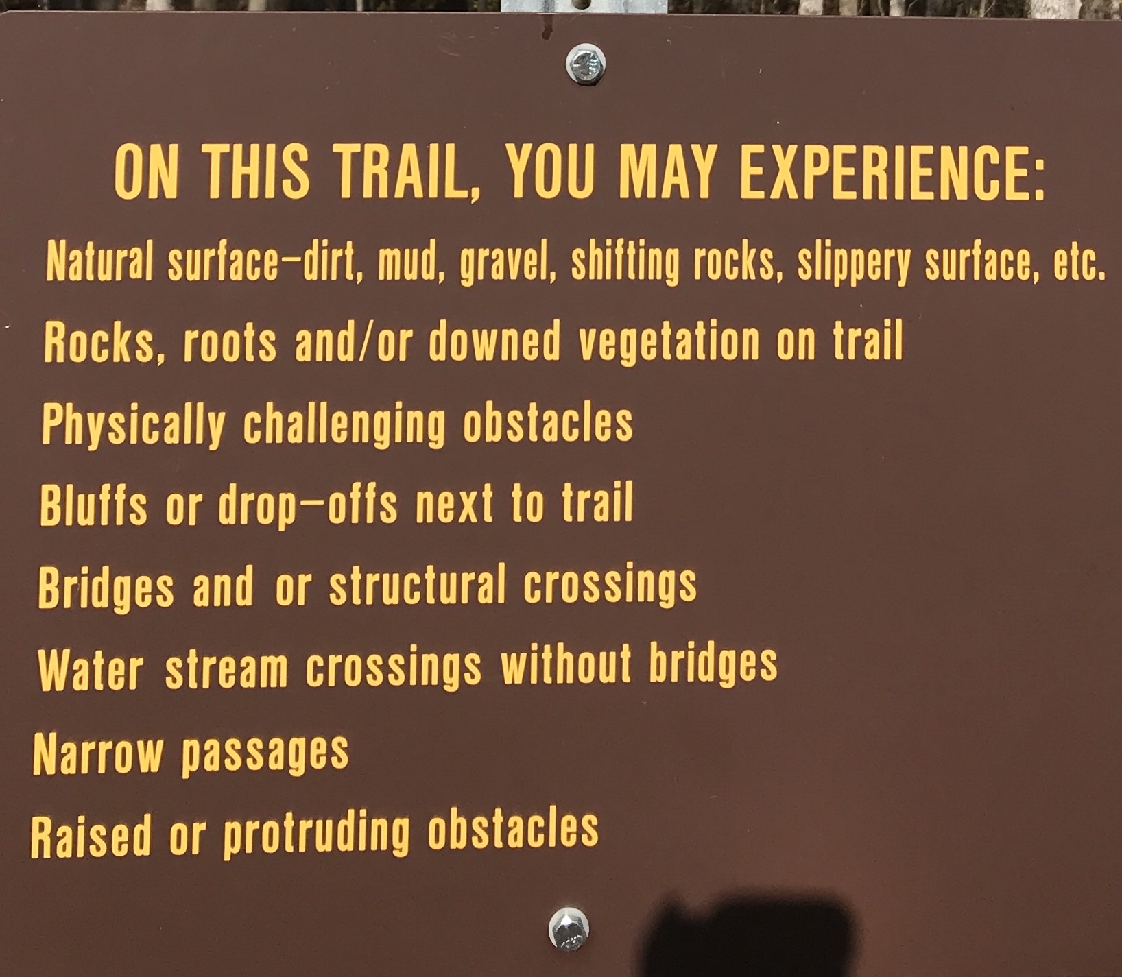 This desire-for-discomfort helps explain another minor mystery, too: a sign posted at the trailhead that seemed to discourage use of the trail. At least, that’s how an Old Dude reads it. A younger hiker (or biker) might exclaim “Sweet!” when reviewing this selfsame catalog of hazards.