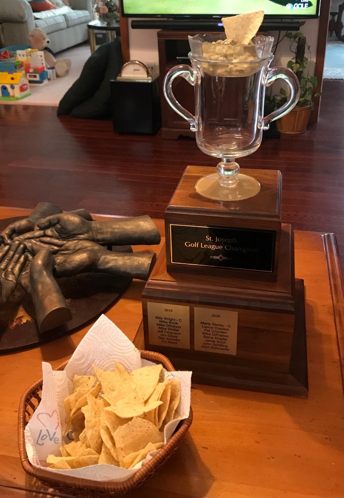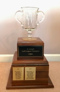 Perhaps a bit to my Sweetie’s regret, I’m having a little trouble making the hand-off of our handsome Golf League Trophy.
