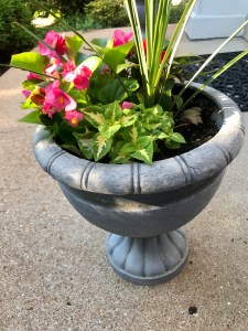 The two pots are identical in size and shape – and a few weeks back, we planted an identical assortment of annuals in each. Or so we thought.