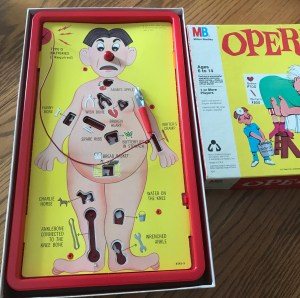 What a consolation, then, to learn that my archaic, outdated and analog world still holds a few charms to engage the imagination of this Digital Girl. She was mightily impressed, for example, when Gramps managed to repair the hard-wired tweezers on “Operation”…and get the Patient’s battery powered light-bulb-nose to illuminate again.