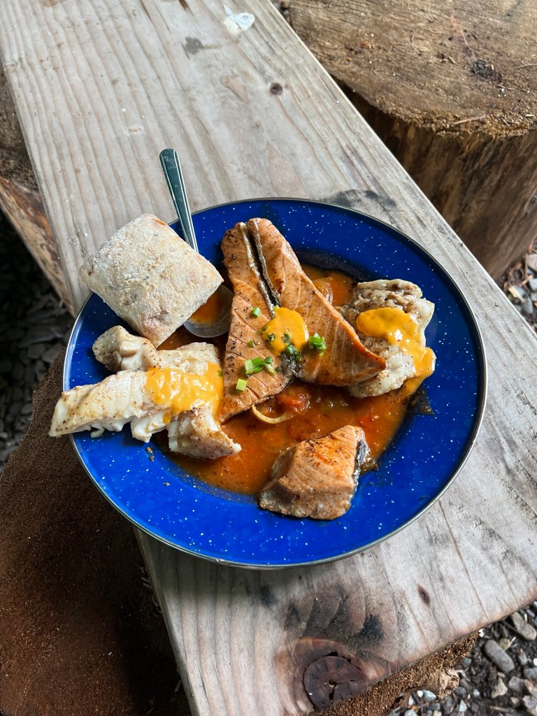 I was still in a bit of a daze when we reached Fish Camp, my heart filled with wonder at the events that had just transpired. Though my catch would not contribute to our communal feast, it did not detract from my enjoyment of the meal: pan-seared rockfish and salmon, nestled atop a steaming bowl of fennel-infused cioppino.