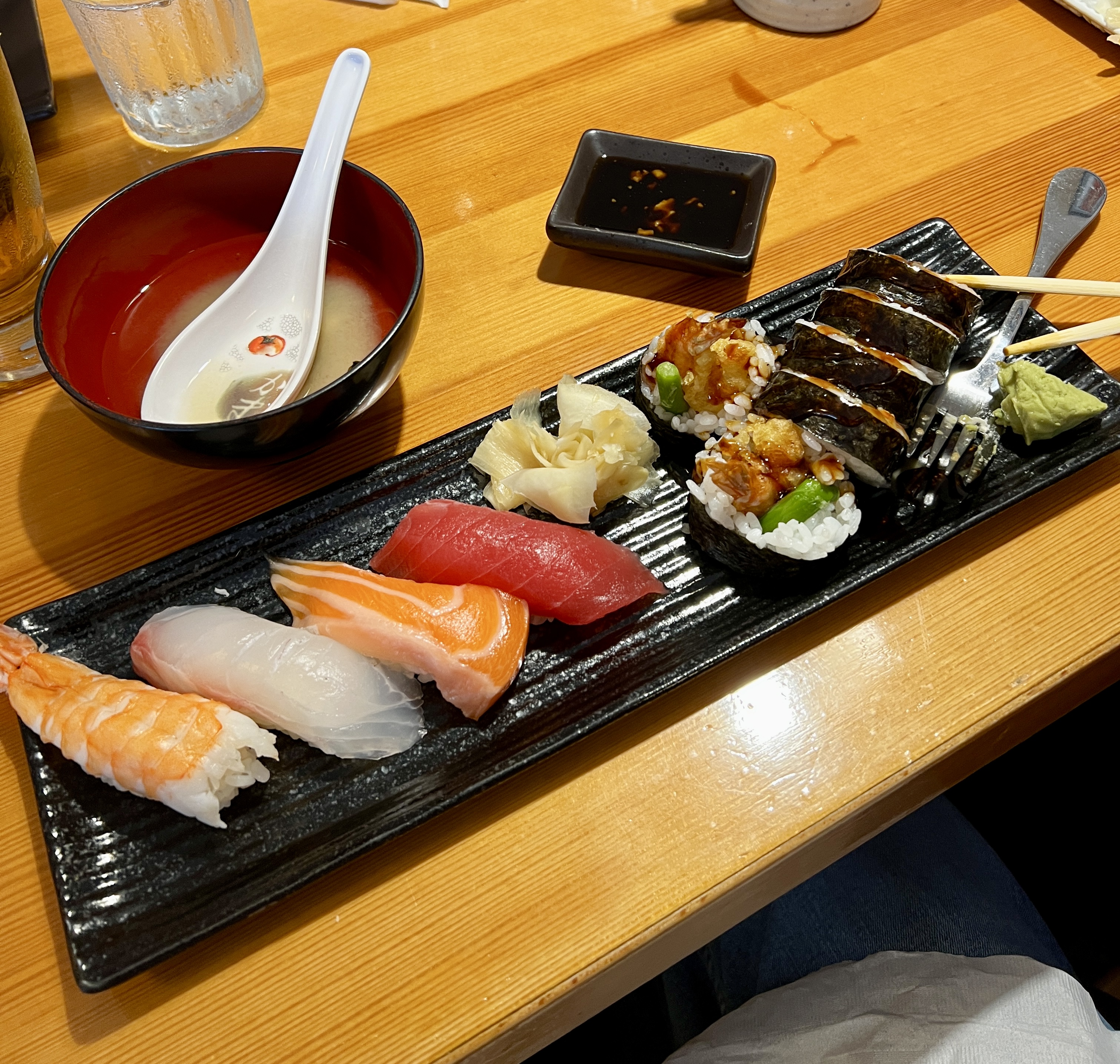 At my son’s suggestion, I dove into the deep end at Tokyo: a nigiri combo plate, with a shrimp tempura roll on the side. And I’ll say this: it was a beautiful thing to see the nigiri arrive – four fresh fish food morsels arranged artfully alongside the shrimp roll on a narrow plate.