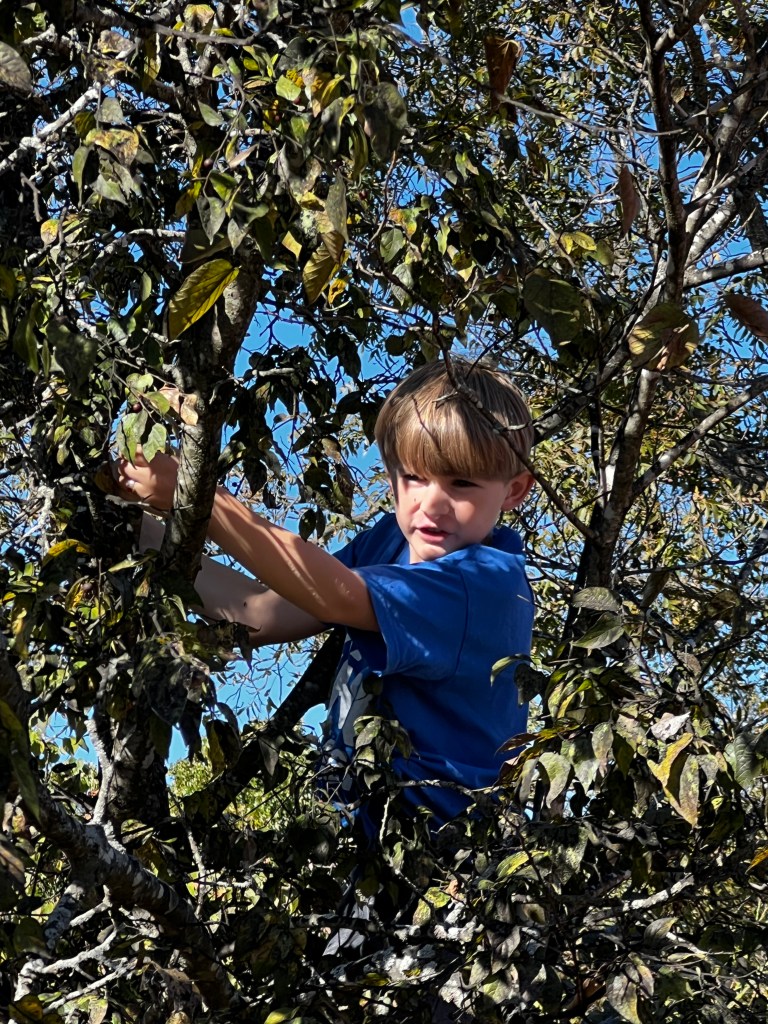 It doesn’t surprise me at all to find one Grandson or the Other up a tree in the yard at their rural home. Neither one can resist the challenge it seems, the adventure to be found in a well-grasped branch or a well-placed foot. (They grasp, and I gasp – whispering a worried prayer to their guardian angels for a safe return to the ground.)