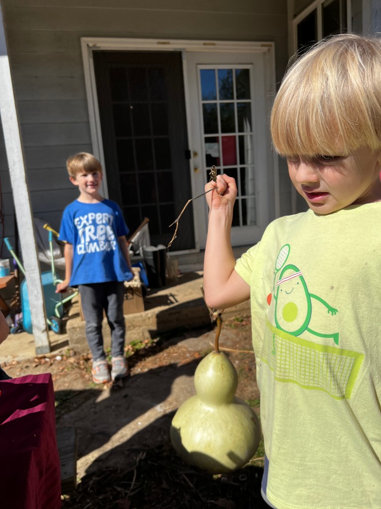 Grandson #1 disappeared into the thicket of the crabapple tree. And so, yesterday’s gourd harvest had begun.