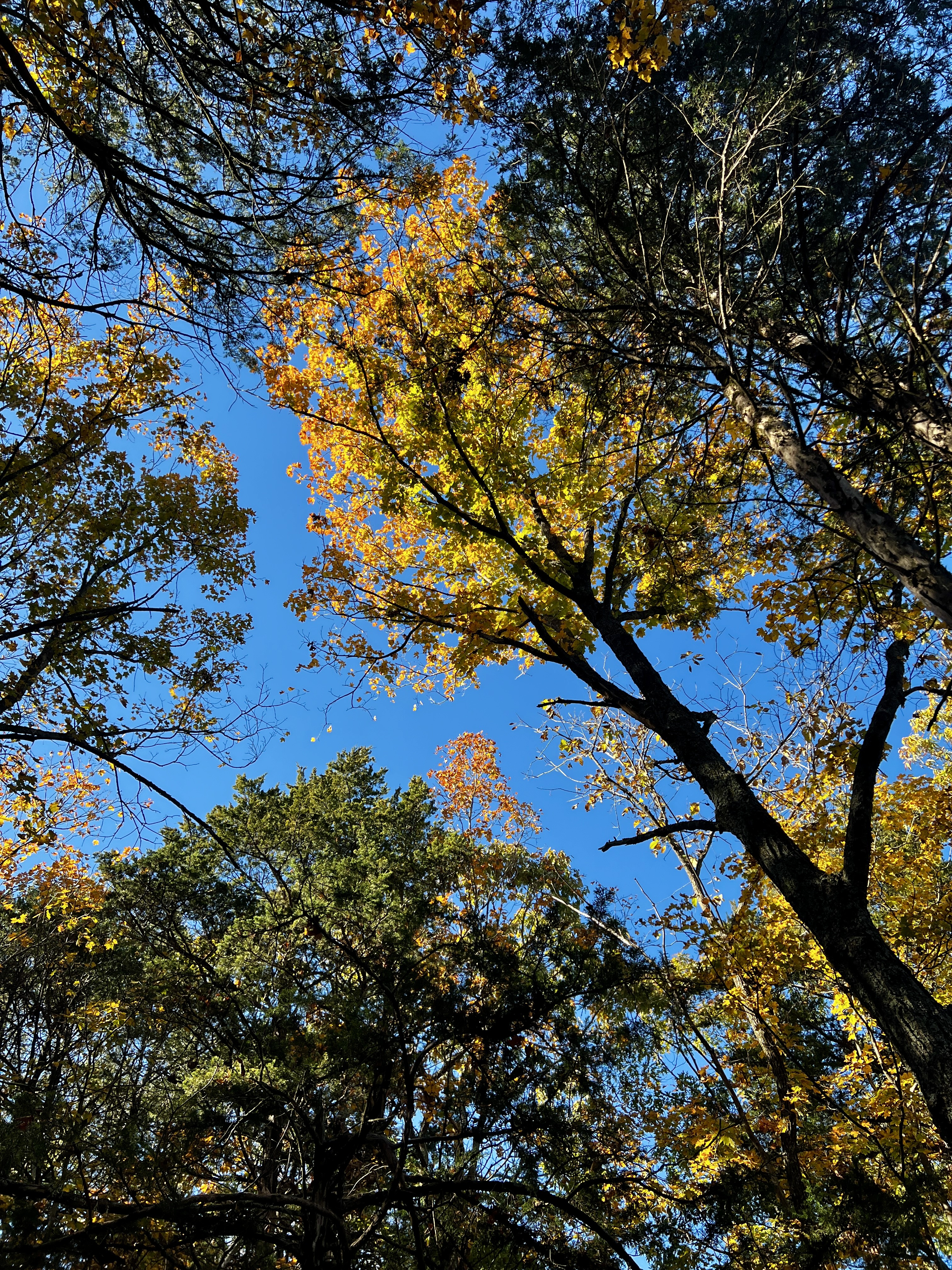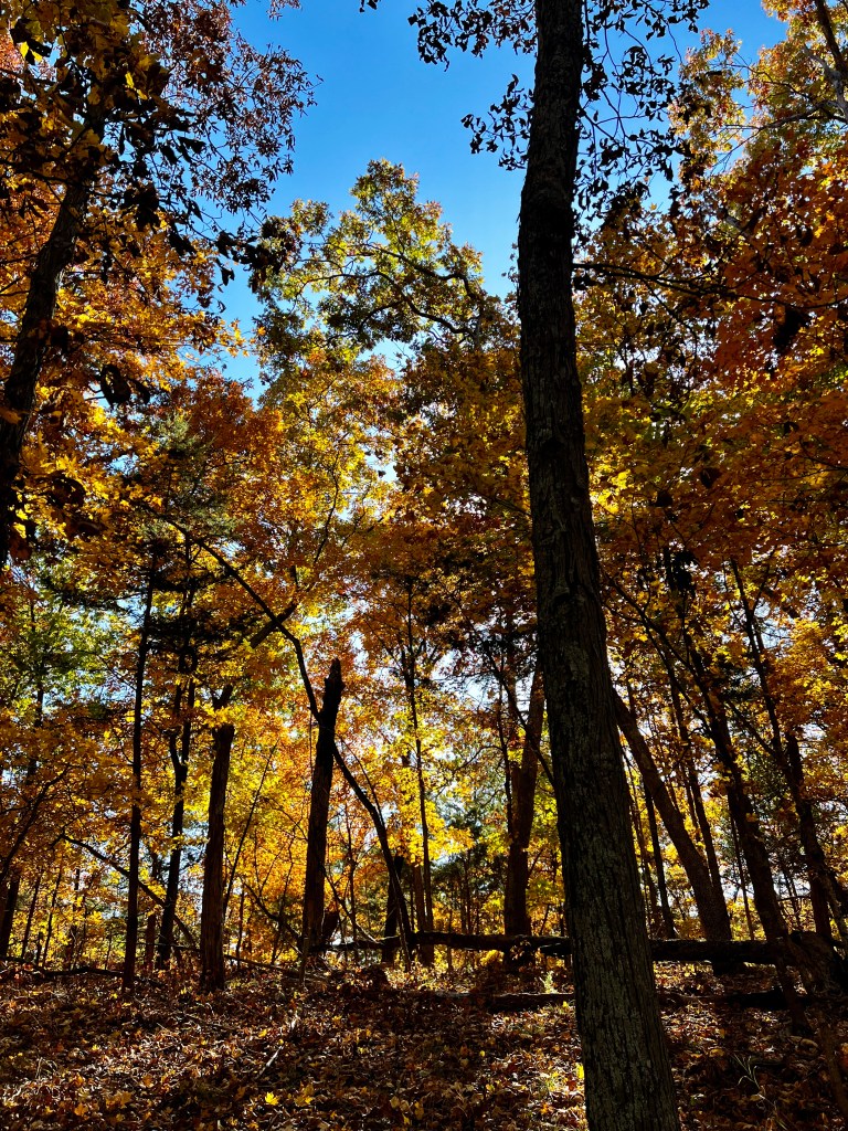 More than enough beauty, too, as long as you don’t get too hung up on the notion of encountering a spectacular vista or two. The glory viewed on “our” section of the trail tended to come in smaller doses, up close and personal: a backlit spray of golden leaves; a tree-trunk-turned-obelisk, drawing the eye heavenward; a now-dry gorge studded with grey granite stones and boulders.