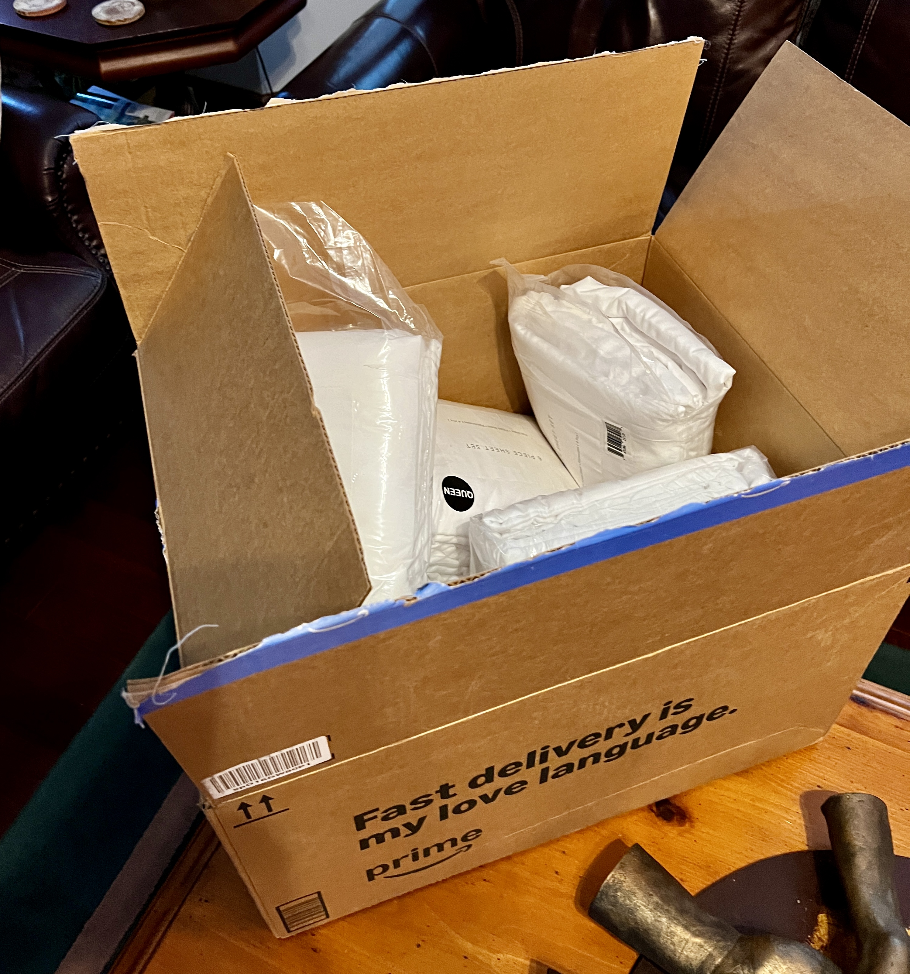 Seven sets of white bed sheets, a fresh set for each day of the week. The sheets arrived, unbidden, in two separate deliveries to our front porch this past week. And clearly, the Amazon guys and gals had done their job flawlessly: both packages had my name on them, my home address.