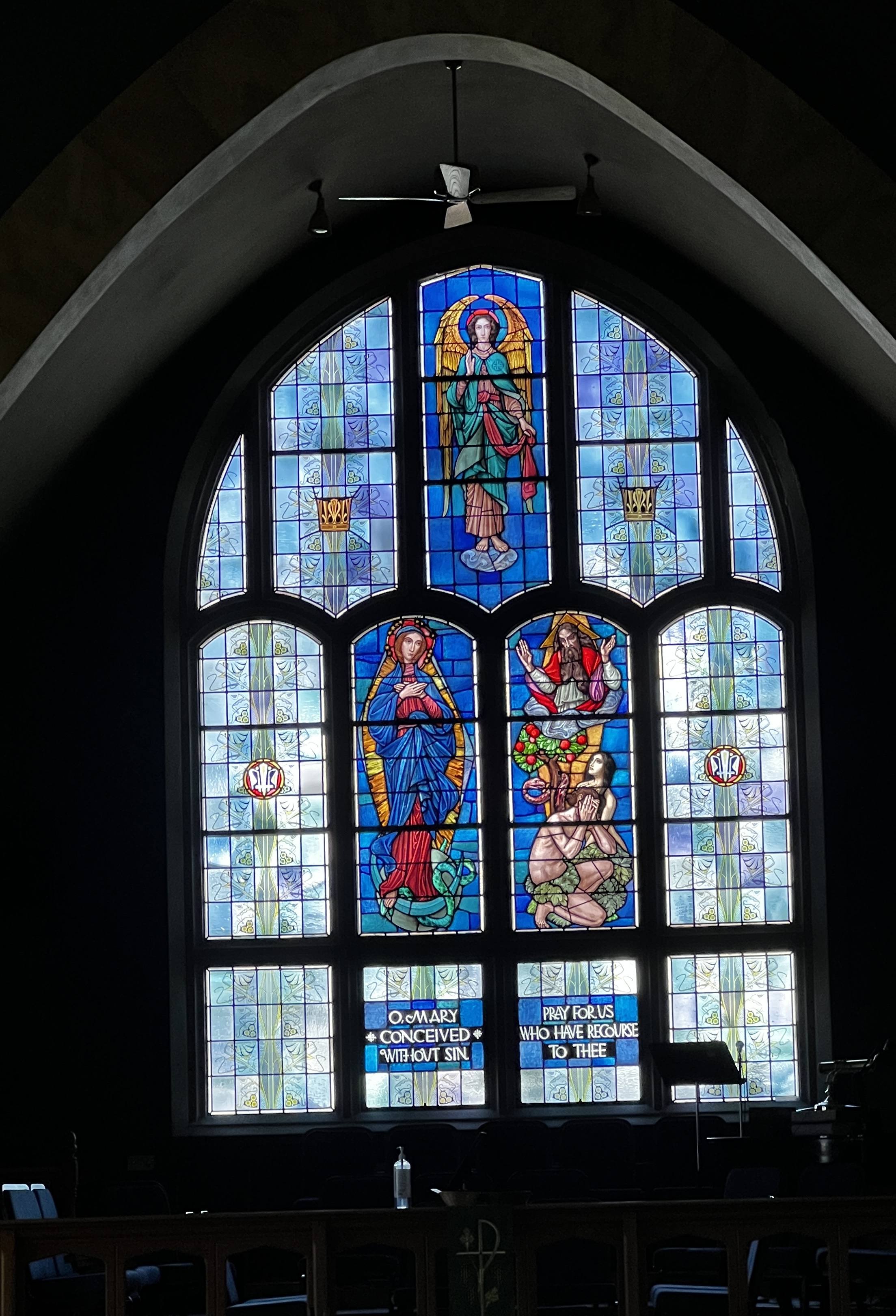 On this encounter, though, it was backlit by the noonday sun. Its gorgeous, even luxurious, light drew me in … so that I started to see the image more deeply. Which turns out to be a bit of a mash-up, scripturally: Mary, celebrated in her Immaculate Conception, being overshadowed by Gabriel at the time of the Annunciation, all (presumably) setting in motion the Incarnation … to save us from Original Sin.