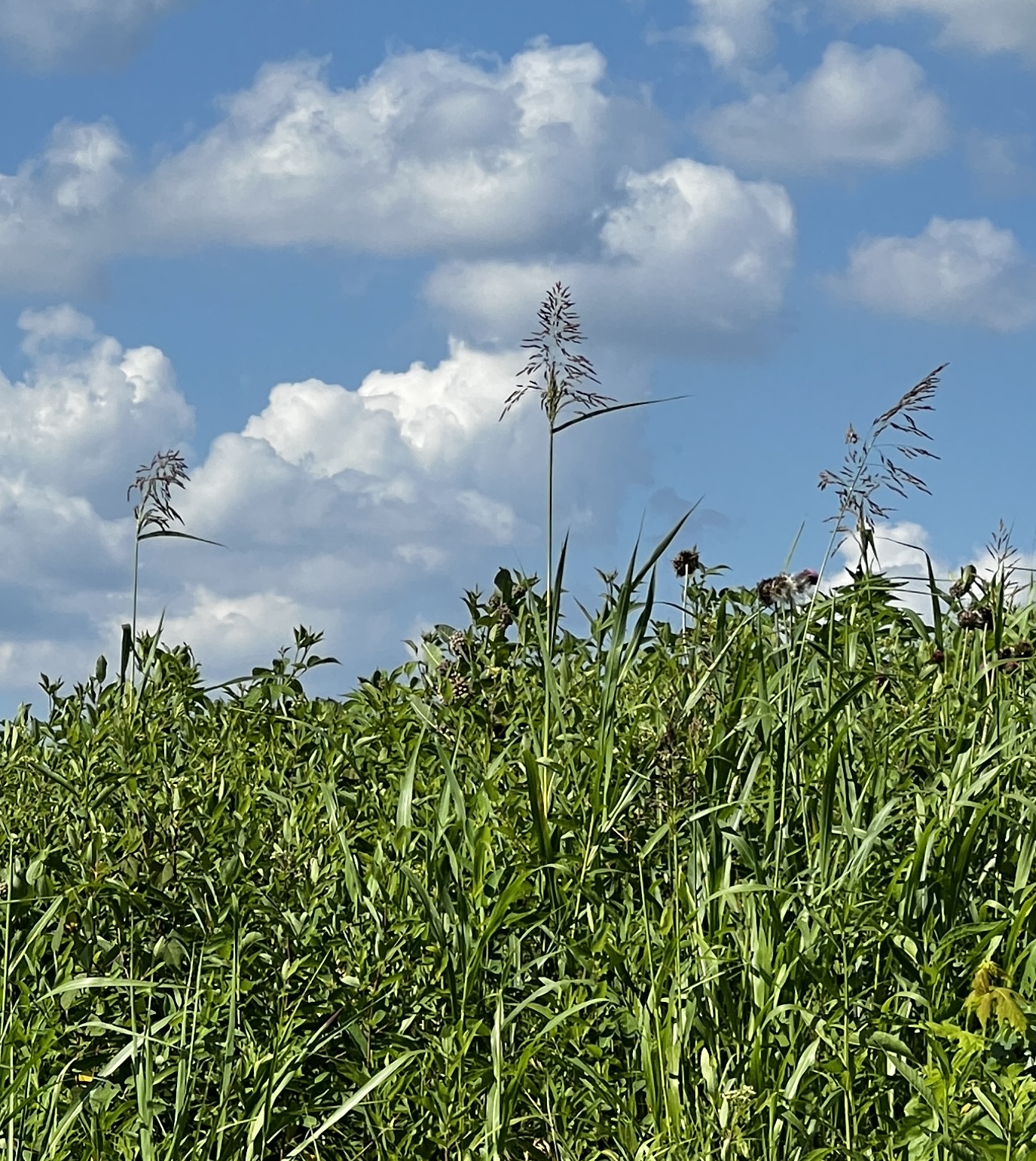 Later that same day, an entirely different image of God blessed me, out on the golf course. I noticed – poking up through a patch of thick green trouble – three stalks of prairie grass that had formed seed-heads. A verdant Trinity, as it were, watching over the woe below and offering a glimpse of hope.