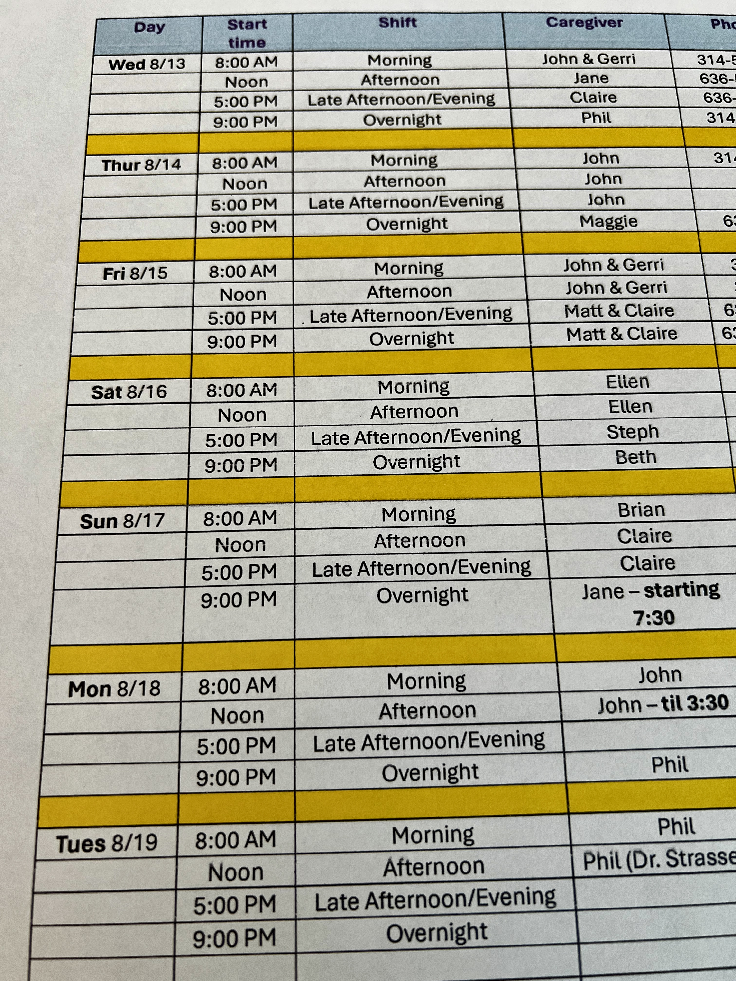 But that, of course, left a bit of a gap to be covered – between her hospital discharge on Wednesday and the commencement of her in-home help. So we put out a call (actually, an email) inviting all of our “sorta local” family members to pitch in as they were able. I have to say the response was impressive: More than two dozen 24X7 “shifts” to fill…and this loving family of ours made it happen, on very short notice.
